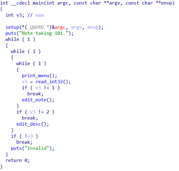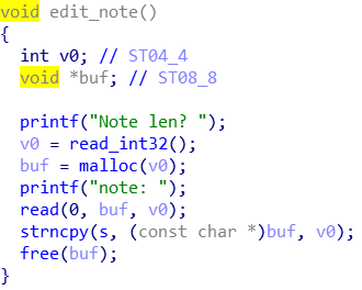 edit_note 부분에서 strncpy로 buf의 데이터를 v0만큼 s에 붙여넣게 되는데, 여기서 처음에 buf에 입력시켜줄 때 v0가 32보다 크게 된다면 저기 bss영역에 데이터가 들어갈 때 s를 넘어서서 buf에까지 데이터를 덮어쓰게 됩니다.