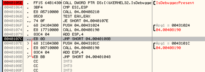 0040106D에서 디버깅당했는지 체크한 뒤에 당했으면 그대로 진행하고 아니라면 넘어가게됩니다.