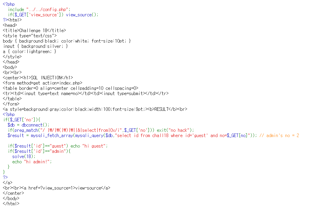 $result = mysqli_fetch_array(mysqli_query($db,"select id from chall18 where id='guest' and no=$_GET[no]")); // admin's no = 2